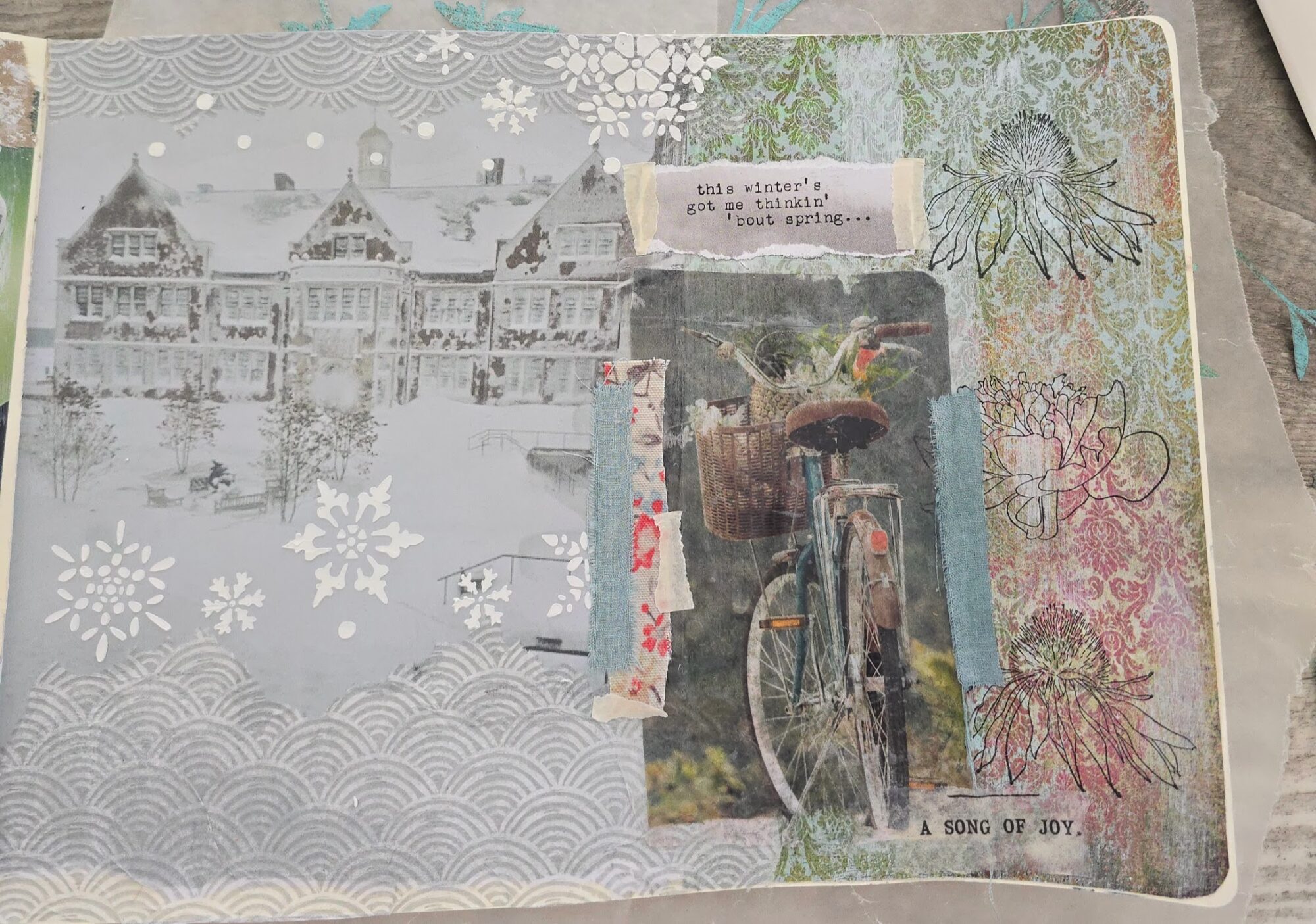 I was working in my art journal yesterday morning. I had been working on a batch of image transfers, one of which—the image of the bicycle with flowers—was going to have a place on this particular page, and the fingertips of the middle and pointer fingers on my right hand were kind of sensitive from scrubbing the top layer of paper off the substrates.
